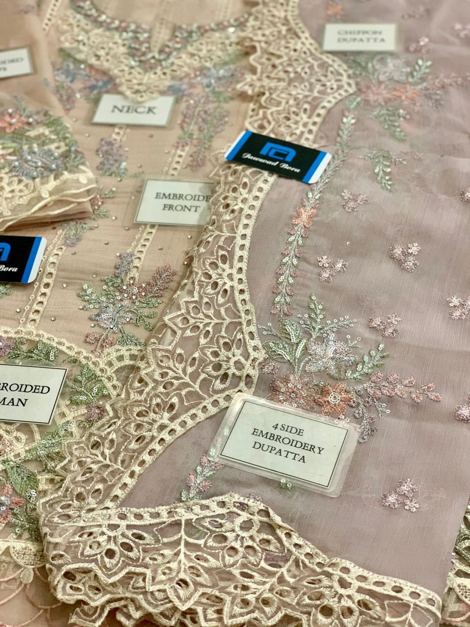 - Four-sided embroidered organza dupatta