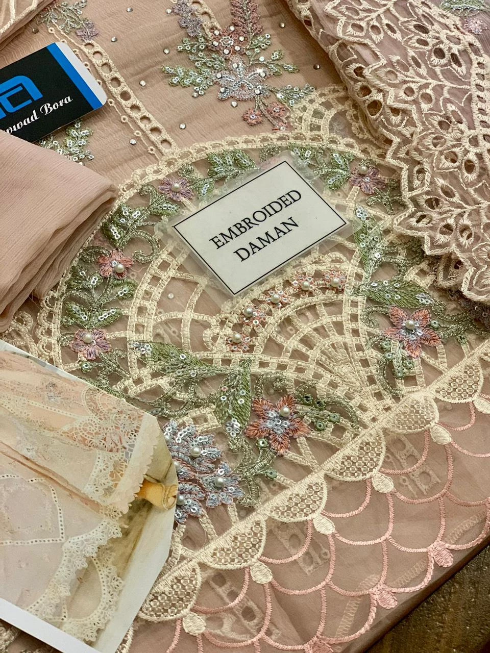 The bottom of the dress chiffon Embroidered (daman) has a fancy border with cutwork and beadwork making it look very elegant.