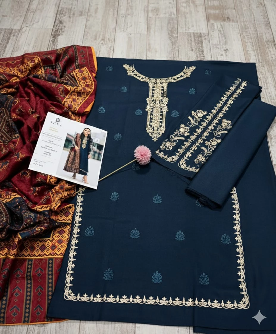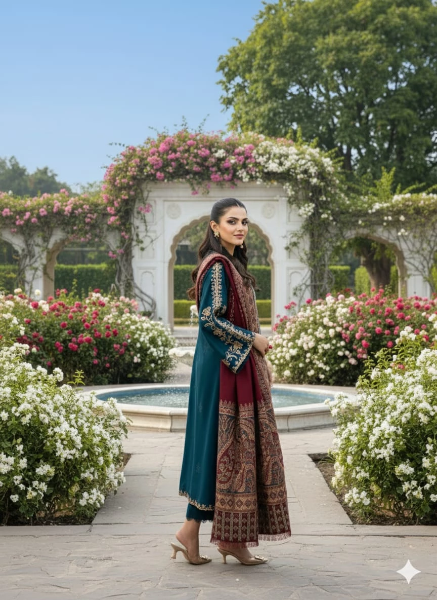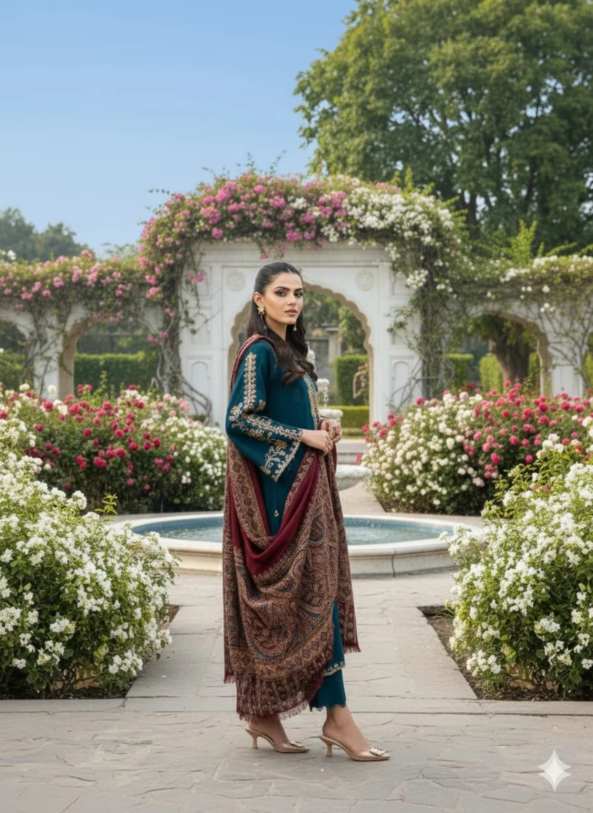 Stay warm without compromising on style with this premium winter suit, crafted for women who love elegant seasonal wear. This embroidered winter suit features heavy detailing on rich Dhanak fabric, paired with a soft pashmina wool shawl that adds warmth and luxury—perfect for winter events and formal gatherings.