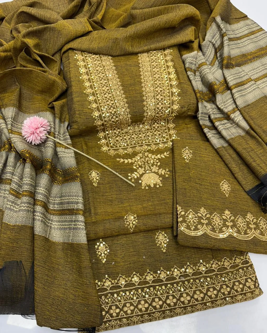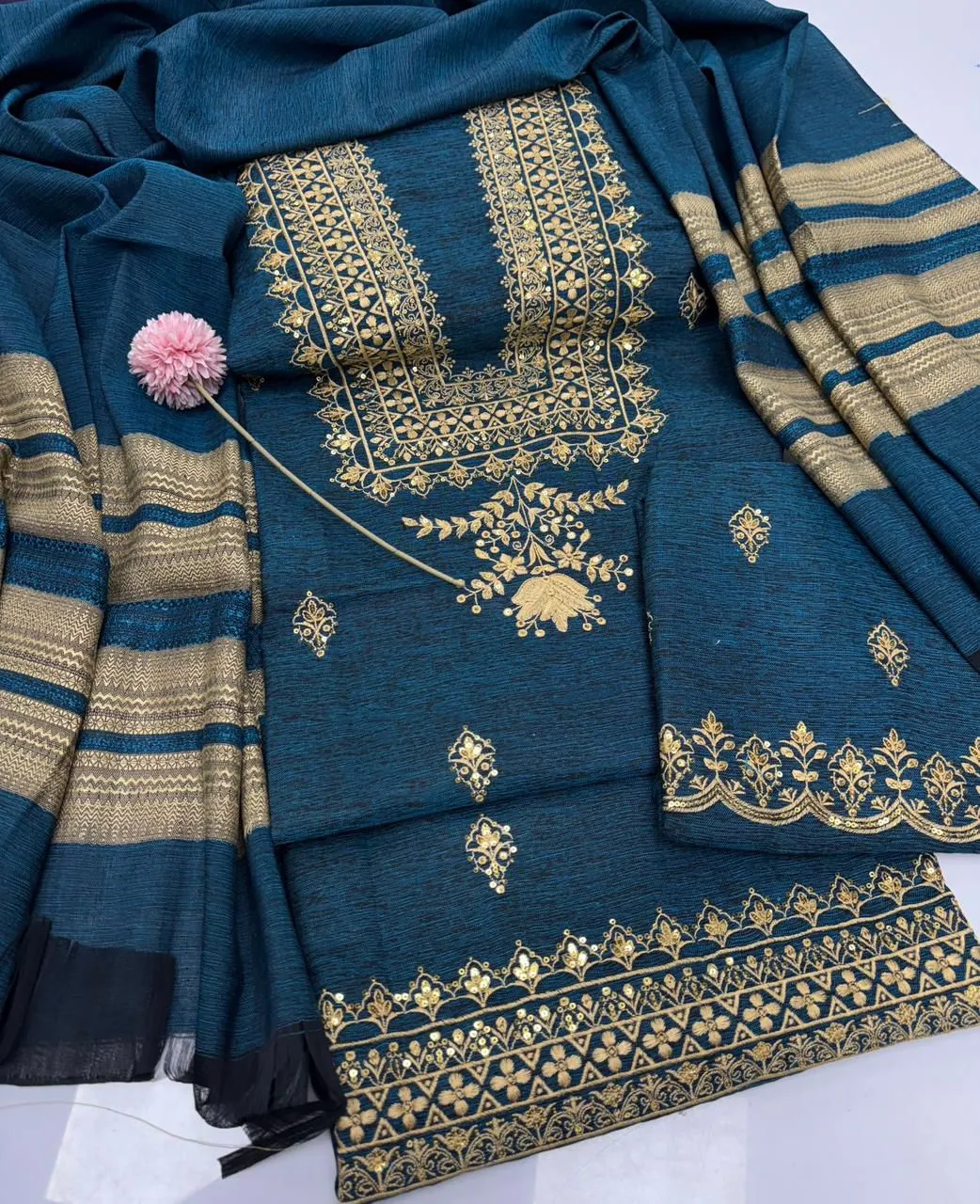 Premium khaadi khadar unstitched 3PC winter suit featuring embroidered sequence neckline panel, embroidered trouser bottom and a luxurious jacquard velvet shawl with bambles work. Warm, elegant and guaranteed premium quality.