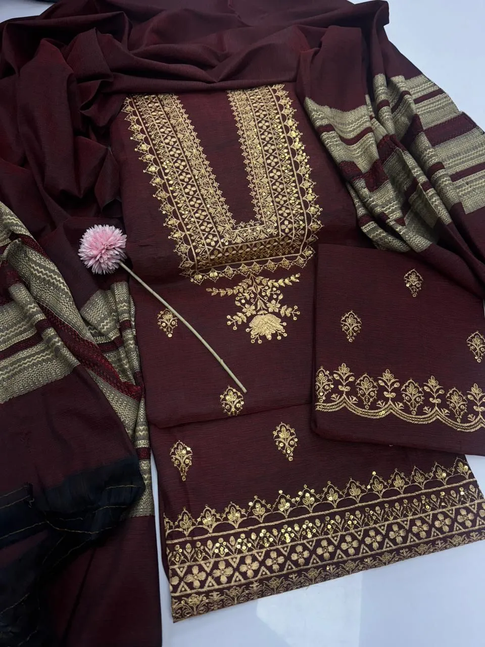 Order now and upgrade your winter wardrobe with this luxury embroidered suit. Limited stock available!