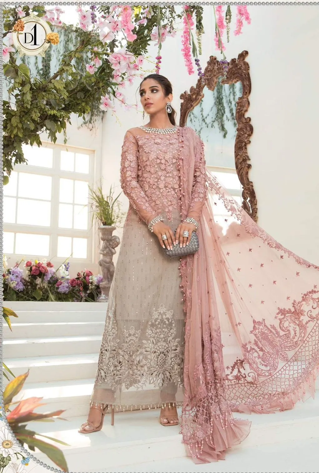 - Sleeves: Embroidered chiffon sleeves with 3D handwork and embellished borders