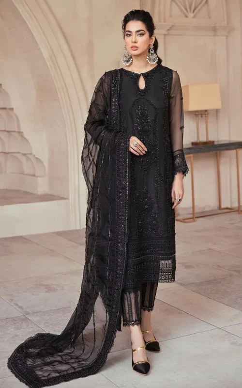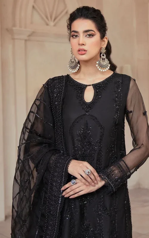 Make a graceful style statement with this luxury organza suit, designed for women who appreciate fine craftsmanship and elegance. This embroidered organza 3PC dress by Sara Rohail Asghar features heavy thread and handwork embroidery, paired with an elegant dupatta and malai trousers—perfect for festive celebrations and formal occasions.