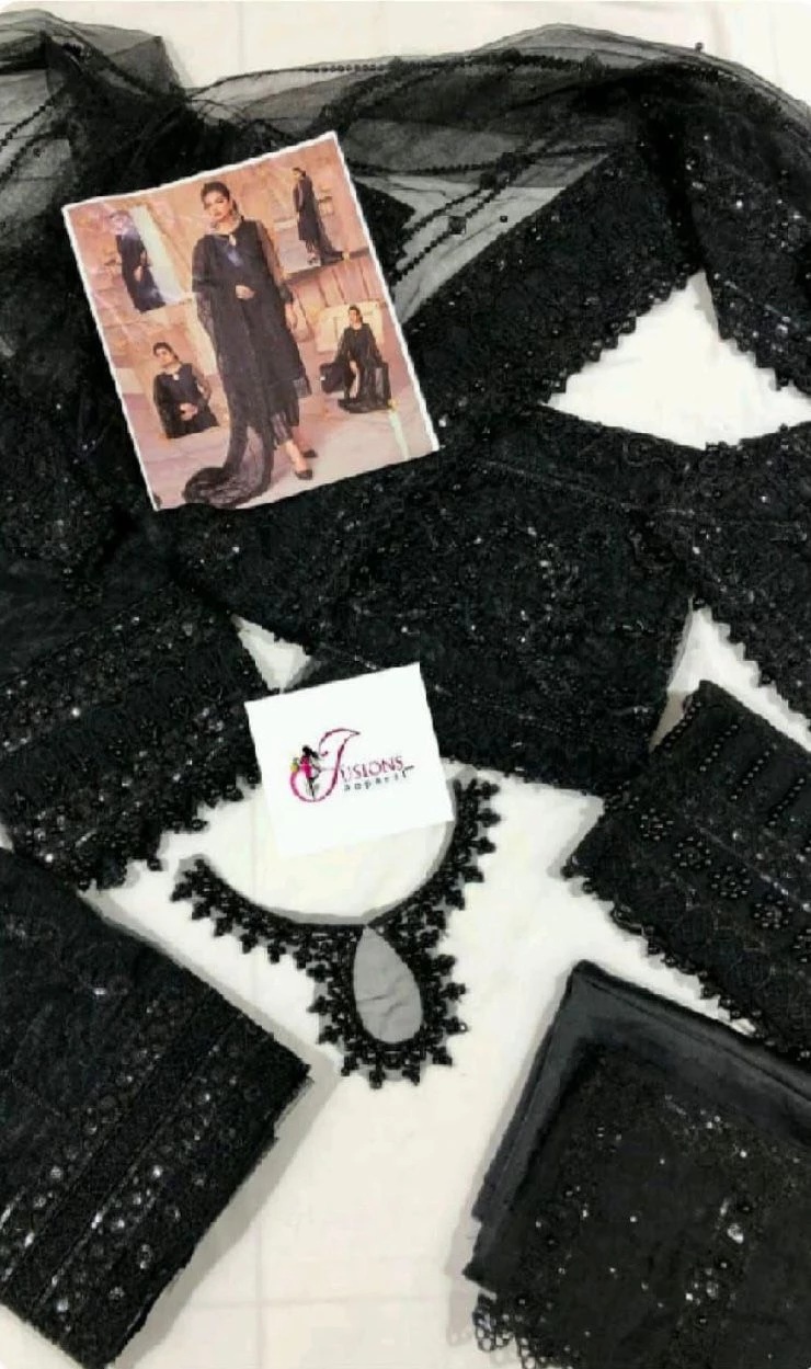 Make a bold luxury statement with these premium net embroidery suits, designed for weddings and formal winter occasions. Crafted from rich velvet fabric, this master replica velvet suit features heavy embroidery and elegant detailing, paired with a beautifully finished net dupatta for a graceful and timeless look.